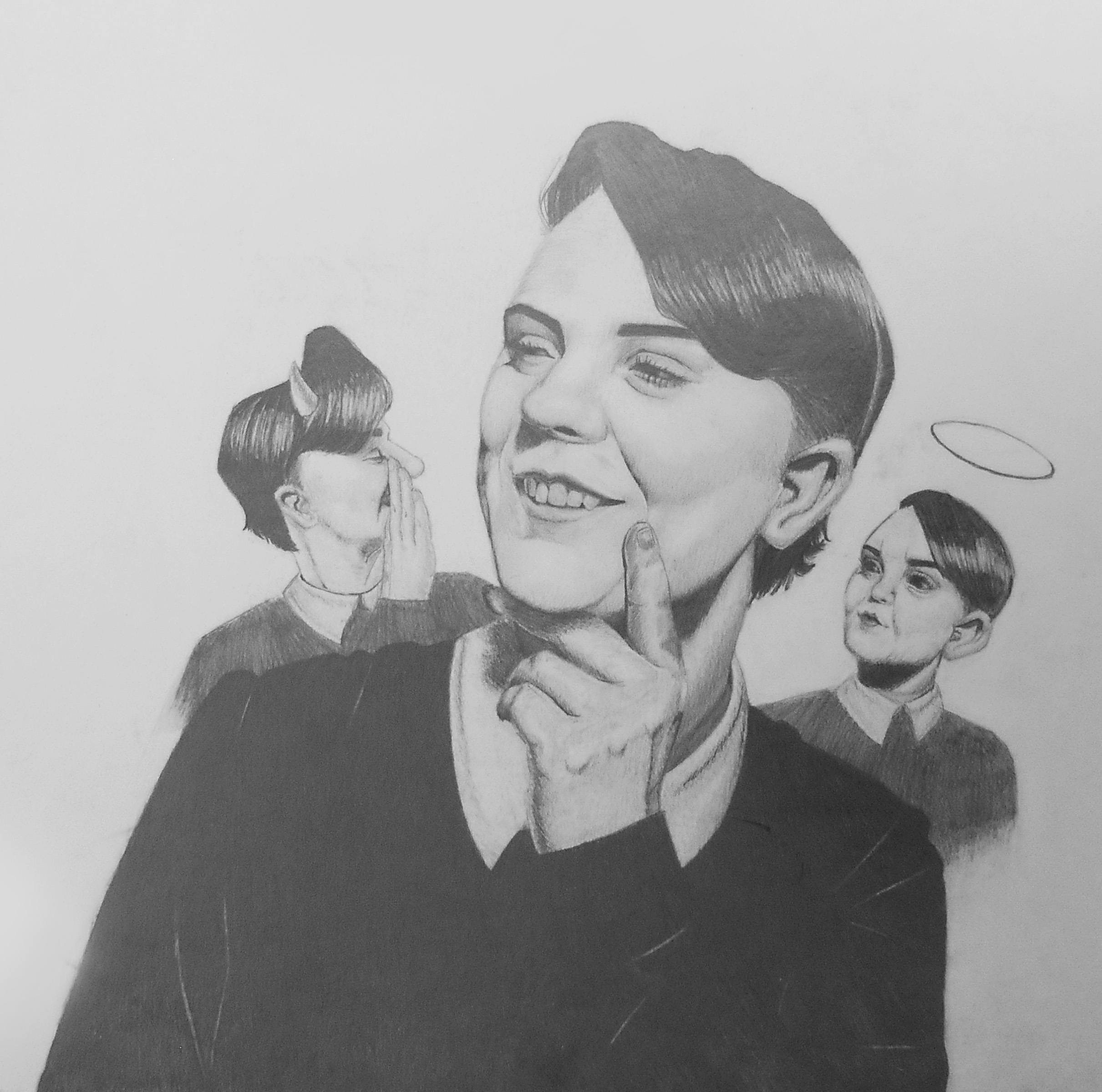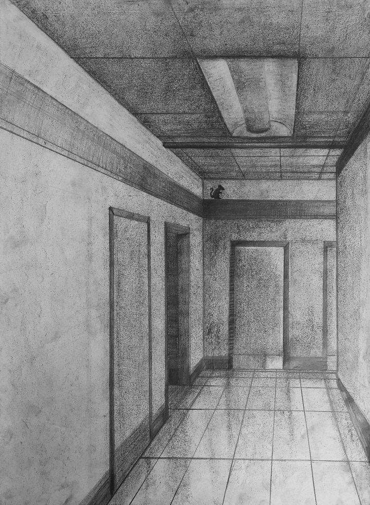 Two Panel Comic, 2022, Graphite, 11 in. x 17 in.Victorian House, 2021, Marker and Ink, Angel and Devil, 2020, Graphite, 18 in. x 24 in.Portrait of my Mom, 2020, Graphite, 18 in. x 24 in.The Evocative Environment, 2019, Colored Pencils, 18 in. x 14 in.The Standing Figure, 2019, Charcoal, 18 in. x 24 in.Self-Portrait, 2018, Charcoal, 22 in. x 22 in.